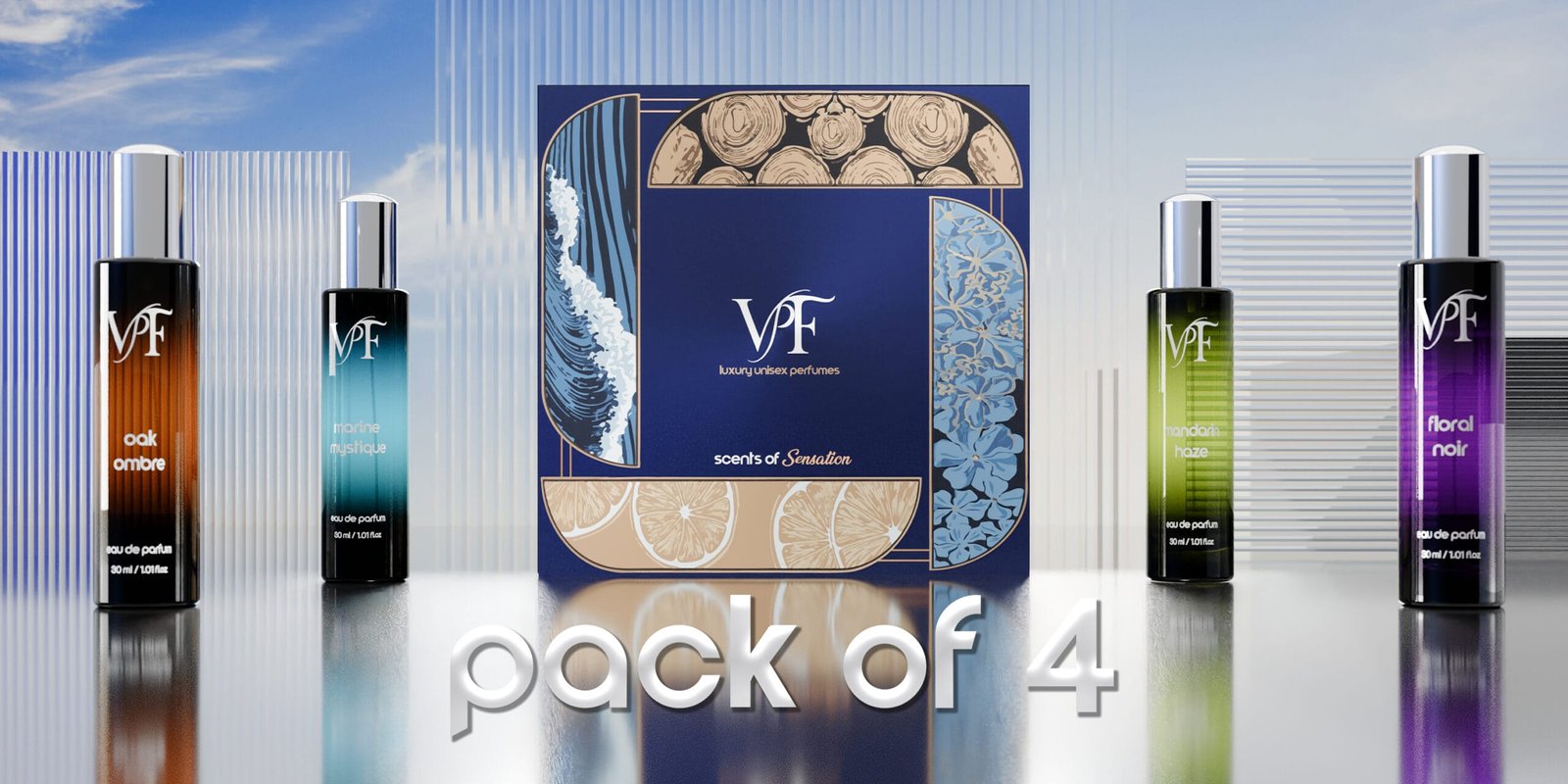 Valencia Scents of Sensation is a vivacious representation of versatility. We offer a premium pack of 4 unisex best smelling perfume designed to create scented memories anytime, anywhere. The mesmerizing Marine Mystique, the olfactory Oak Ombre, the sensual Floral Noir, and the zesty Mandarin Haze. This beautifully crafted set lets you switch your scent game effortlessly. Ideal for gifting or personal indulgence, Valencia Scents of Sensation offers long-lasting, signature fragrances for both men and women. Elevate your fragrance wardrobe with this all-in-one perfume combo. Your everyday luxury, bottled.